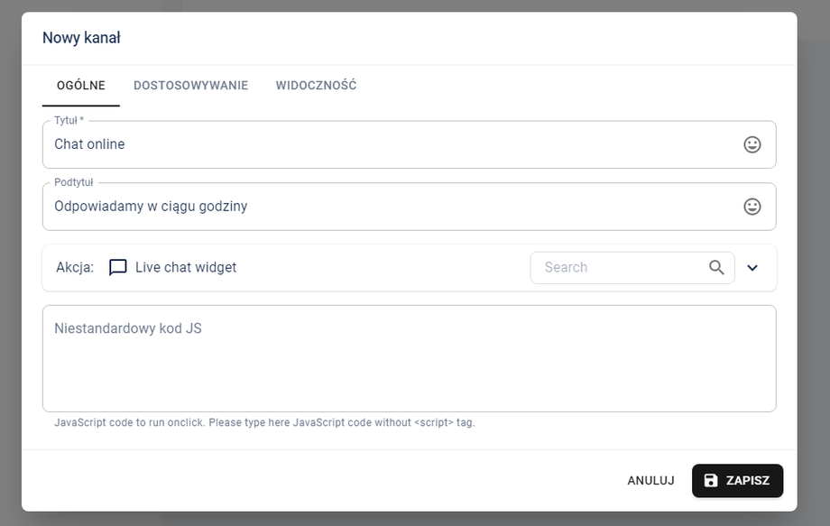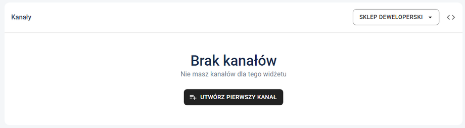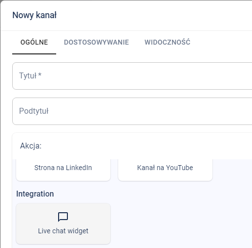Kliknij na przycisk na samym środku tj. "Utwórz pierwszy kanał". W ten sposób możesz dodać multum różnych elementów, ale lecimy z najprostszym. Z listy "Akcja" wybierz "Integration" i "Live chat widget":