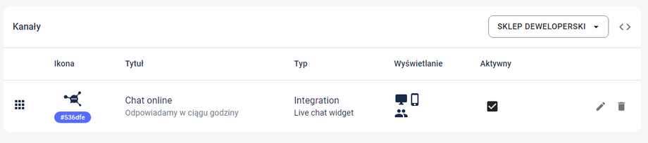 Mamy podłączoną opcję naszego czatu do sklepu. Ale na sklepie nic się jeszcze nie pojawi, bo żadnych form kontaktu jeszcze nie aktywowaliśmy.