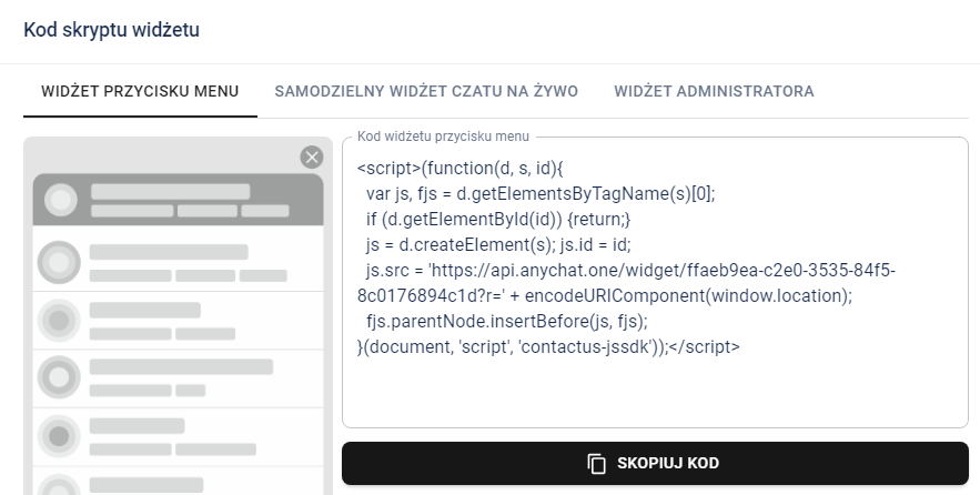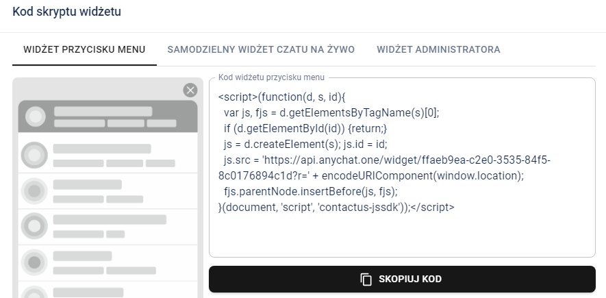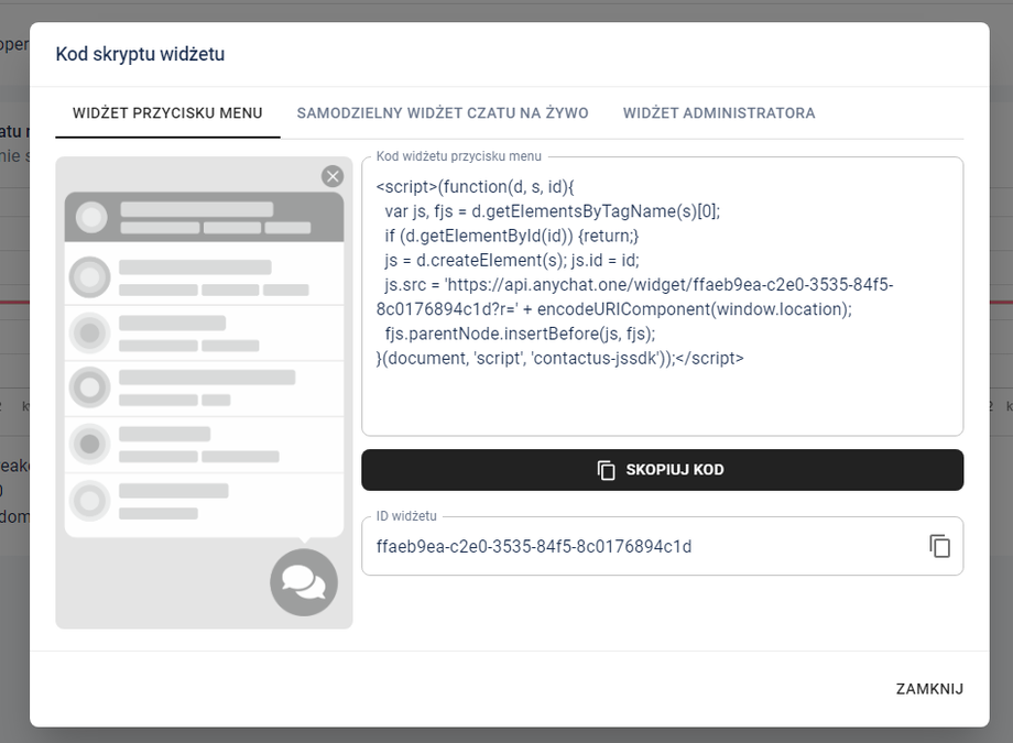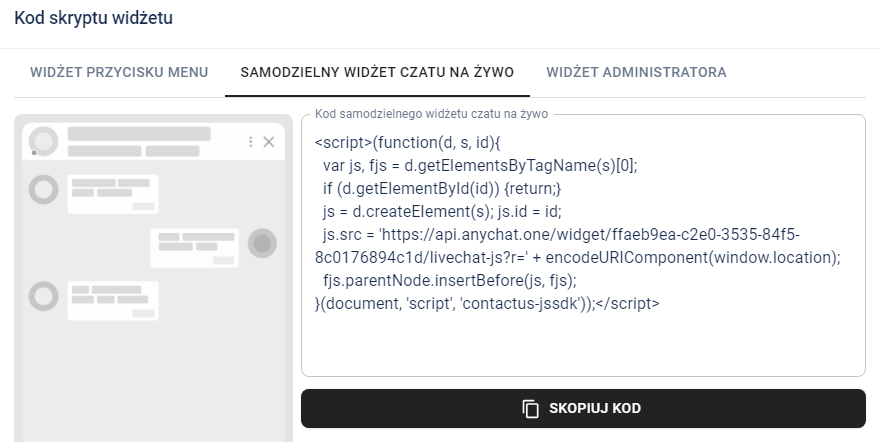Dla dalszych kroków poradnika wybieram opcję numer jeden, czyli widżet czatu na bogato. Wybierz zakładkę i skopiuj kod:
