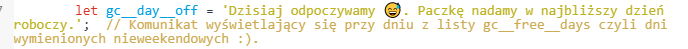 Skrypt radzi sobie z weekendami, ale nie wie kiedy mamy w Polsce jakieś wolne. Tu jest miejsce na ich uzupełnienie. Urlop na sklepie? Także uzupełnij daty.