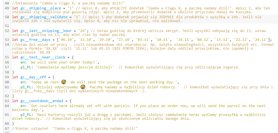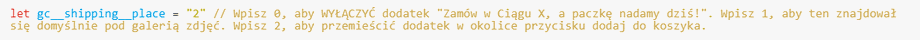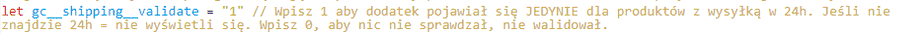 gc__shipping__validate odpowiada za sprawdzanie, czy na karcie produktu jest informacja o czasie wysyłki w 24h. Jeśli w tym miejscu ustawisz 1, to skrypt pokaże się jedynie dla produktów, które mają klasyczną szybką wysyłkę, a ukryje się dla produktów o długim czasie wysyłki, aby nie wprowadzić klienta w błąd.