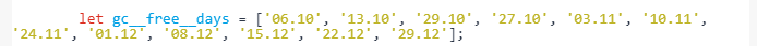 Każdy dzień obejmujemy cudzysłowem w formie ’10.07’. Jeśli wolne jest dnia 7dmego, zwróć uwagę, że dopisujemy zero. Tak samo z miesiącem. Wolne dnia siódmego lipca wychodzi jako ’07.07’. Kolejne dni oddzielamy przecinkiem.