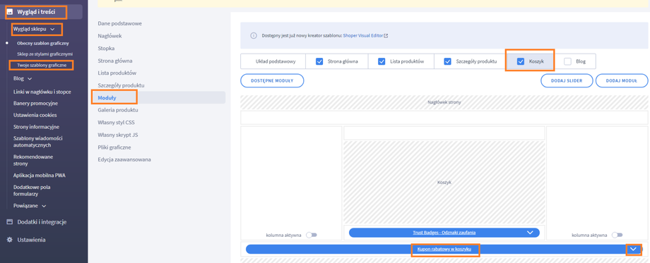 Wyszukujemy nasz szablon lub jego kopię zapasową (zależy na której pracujesz) i wybieramy ikonę pierwszego ołówka. W menu po lewej na szarym tle wybierz „Moduły” i nawiguj do „Koszyka”.