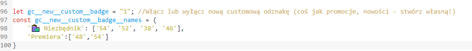 W drugim ustawieniu wpisz wyświetlaną nazwę odznaki oraz ID produktów, dla których wyświetlane mają zostać nasze nowe odznaki. ID podaj w formacie ‘nazwa odznaki’:[‘ID1’,’ID2,’ID3’],