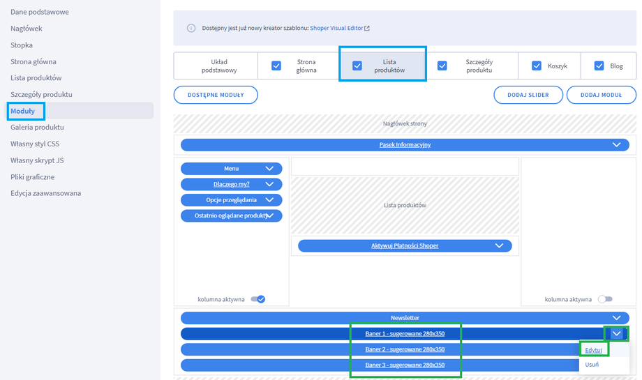 Edycję modułów zaczynamy w edycji Twojego szablonu graficznego. Z szarego menu wybierz "Moduły" i wybierz edycję "Listy produktów":