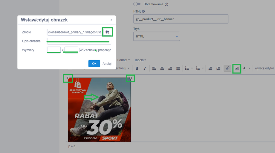 Kliknij piktogram obrazu by wstawić własny. W małym okienku wybierz nowy obrazek. Wpisz opis obrazka jeśli zależy Ci na SEO. Opisujesz co tam się na obrazku dzieje i ewentualnie brand. Akceptowalne: "Super pończochy marki Adrian tylko na Adrian.pl".