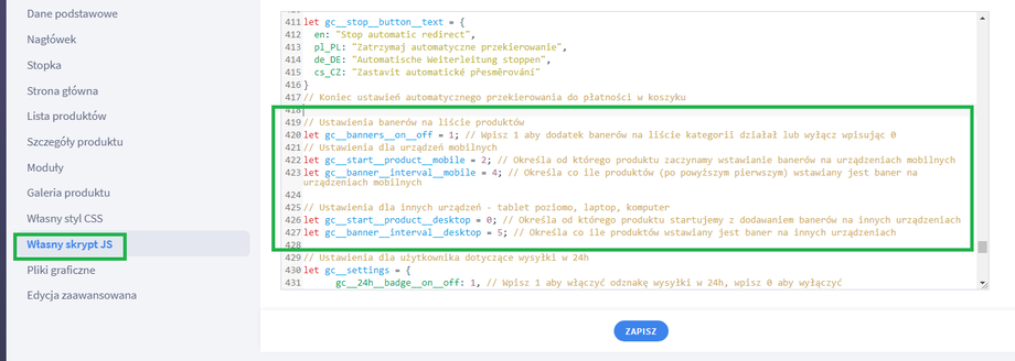 Nawiguj do "Własny skrypt JS". Tam około linijki 419 (plus minus, to się może zmieniać dość dynamicznie) znajdziesz nasze ustawienia dotyczące banerów.