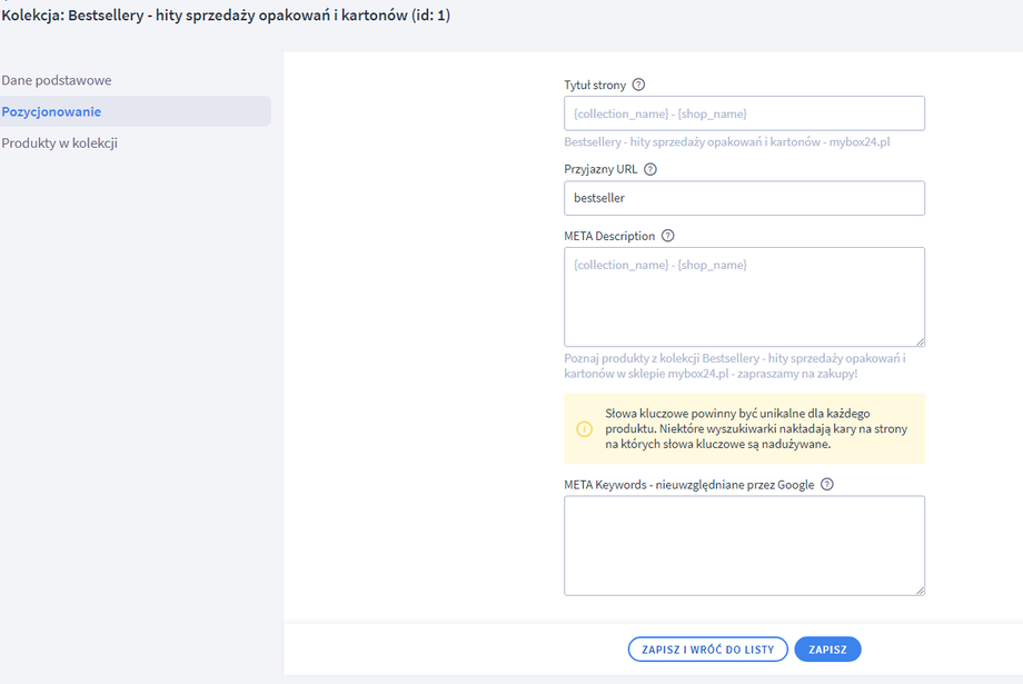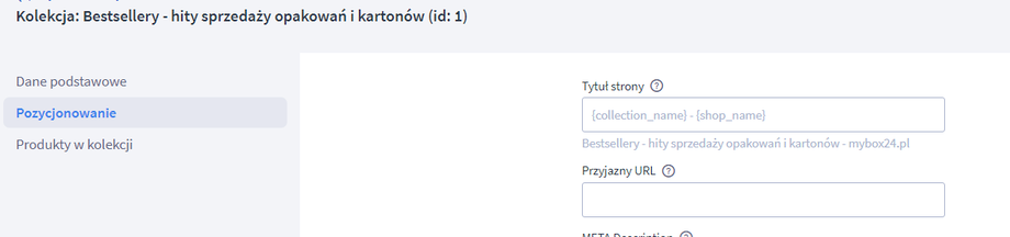 Możesz dopisać coś też na dole, ja na ten moment klikam "Zapisz". Po zapisaniu po lewej stronie odnajdziesz "Pozycjonowanie" dla tej naszej kolekcji.