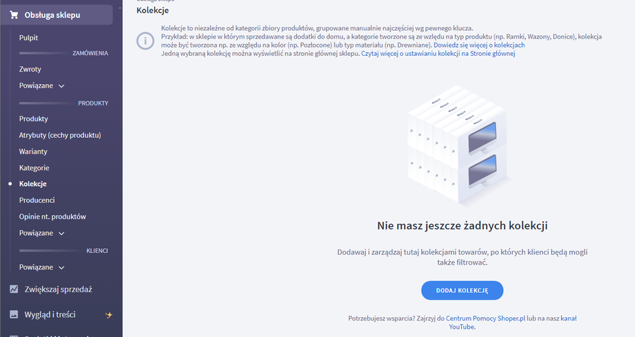 Przejdź w menu sklepu po lewej kolejno "Obsługa sklepu" -> "Kolekcje". (Hej, to może być także kategoria, to jedynie sugestia i najprostsza opcja realizacji!).