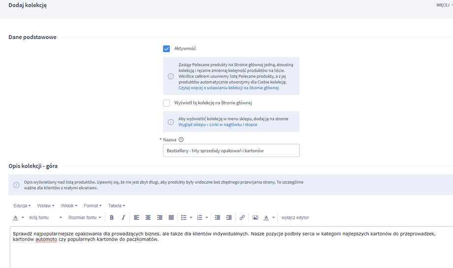 Kliknij "Dodaj kolekcję". Zaznaczam pstryczek aktywności, raczej nie pstrykaj drugiego do wyświetlania jej na stronie głównej (po co, skoro ją podlinkujemy).