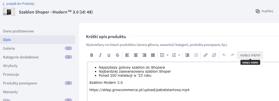 Po otwarciu produktu kliknij po lewej w "Opis" i dalej znajdź pole skróconego opisu. Wyłącz edytor: