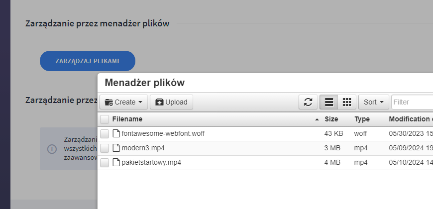 Kliknij "Zarządzaj plikami" i pojawi się okienko uploadu. Zapisz sobie w notatniku nazwę przesyłanego pliku + rozszerzenie np modern3.mp4 lub pakietstartowy.mp4: