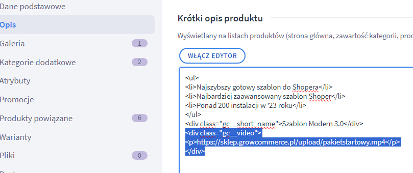 Zakładam, że stworzyłeś swój URL do filmiku według poprzedniego przepisu. Teraz stworzony URL (w moim przypadku https://sklep.growcommerce.pl/upload/pakietstartowy.mp4 ) postawiamy do znacznika: