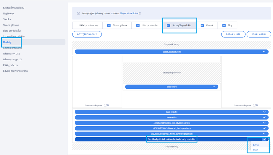 Moduł jako treści edytujemy w naszych modułach. Czyli idziemy do edycji szablonu ->
