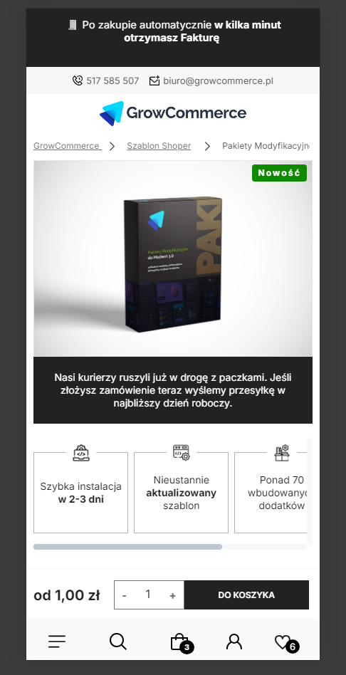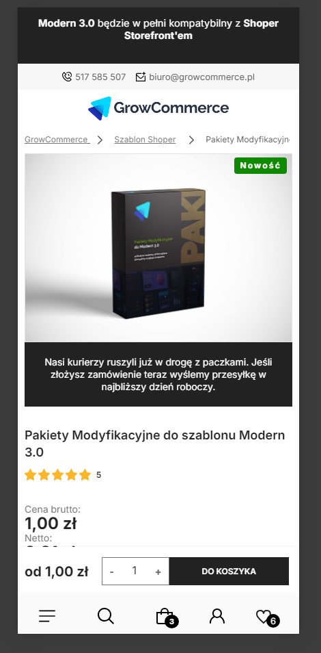 I teraz: o ile moduł super wygląda na komputerze, tak moim zdaniem nie powinieneś/aś go uruchamiać na mobile. Jako Modern 3.0 przeszliśmy już setki audytów i zaleceń i z karty produktu klaruje się, że KONIECZNIE od razu po wejściu na kartę produktu powinno być widać produkt, w miarę możliwości cenę i "CTA" czyli wezwanie do działania, czyli Kup Teraz.