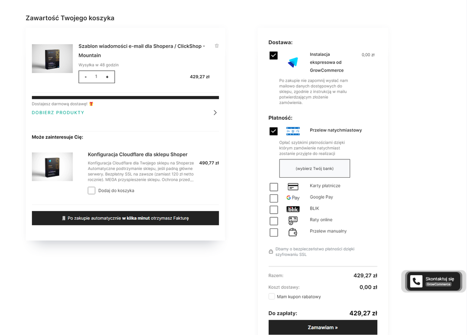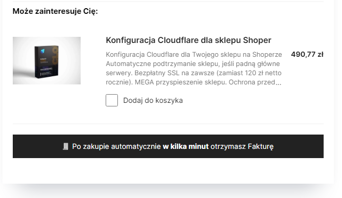 W związku z tym, naszą dosprzedażą w koszyku są produkty o wartości od 300 do 600zł czyli Wsparcie Techniczne, Szablon wiadomości email oraz Konfiguracja CloudFlare.