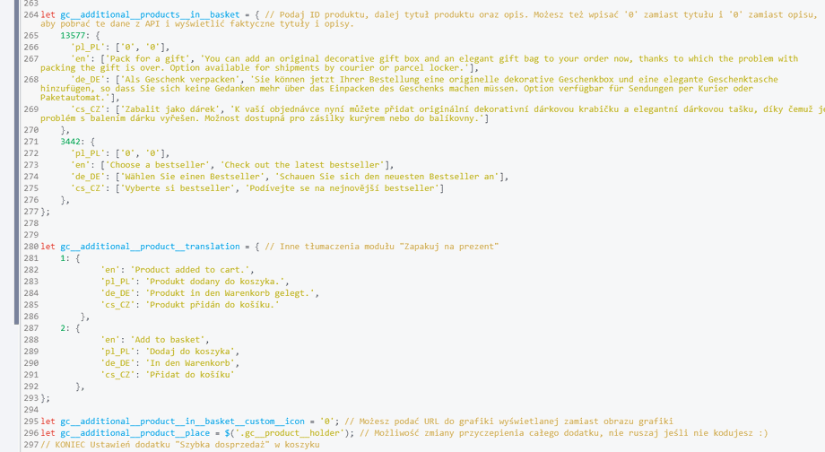 let gc__additional__products__in__basket = { 54:{ 'pl_PL': ['0', '0'], 'en': ['Pack for a gift', 'You can add an original decorative gift box and an elegant gift bag to your order now, thanks to which the problem with packing the gift is over. Option available for shipments by courier or parcel locker.'], 'de_DE': ['Als Geschenk verpacken', 'Sie können jetzt Ihrer Bestellung eine originelle dekorative Geschenkbox und eine elegante Geschenktasche hinzufügen, so dass Sie sich keine Gedanken mehr über das Einpacken des Geschenks machen müssen. Option verfügbar für Sendungen per Kurier oder Paketautomat.'], 'cs_CZ': ['Zabalit jako dárek', 'K vaší objednávce nyní můžete přidat originální dekorativní dárkovou krabičku a elegantní dárkovou tašku, díky čemuž je problém s balením dárku vyřešen. Možnost dostupná pro zásilky kurýrem nebo do balíkovny.'] }, 38:{ 'pl_PL': ['0', 'Piękne maile w Twoim sklepie przy każdym komunikacie. Od przyjęcia zamówienia, aż po jego wysyłkę.'], 'en': ['Choose a bestseller', 'Check out the latest bestseller'], 'de_DE': ['Wählen Sie einen Bestseller', 'Schauen Sie sich den neuesten Bestseller an'], 'cs_CZ': ['Vyberte si bestseller', 'Podívejte se na nejnovější bestseller'] } };