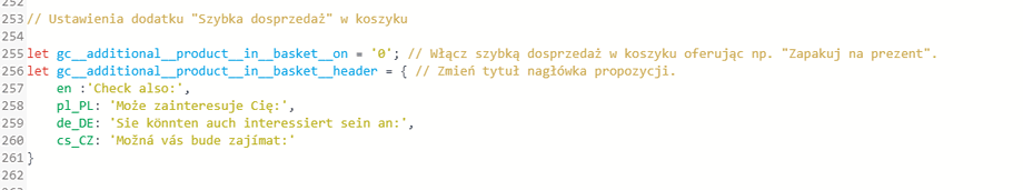 Poniżej w ustawieniu gc__additional__product__in__basket__header wpisz w cudzysłowie ofertę skierowaną do klienta. Jak zwykle możesz zmienić komunikat w czterech podstawowych językach.