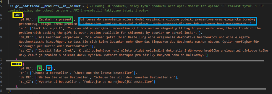 Żółte: wpisz ID produktu, w tym przypadku 46 zamieniasz na ID produktu dodanego w sklepie o nazwie "Zapakuj na prezent". Taki produkt powinien mieć cenę dosłownie zapakowania. Klient wtedy jednym kliknięciem dodaje go do zakupów.