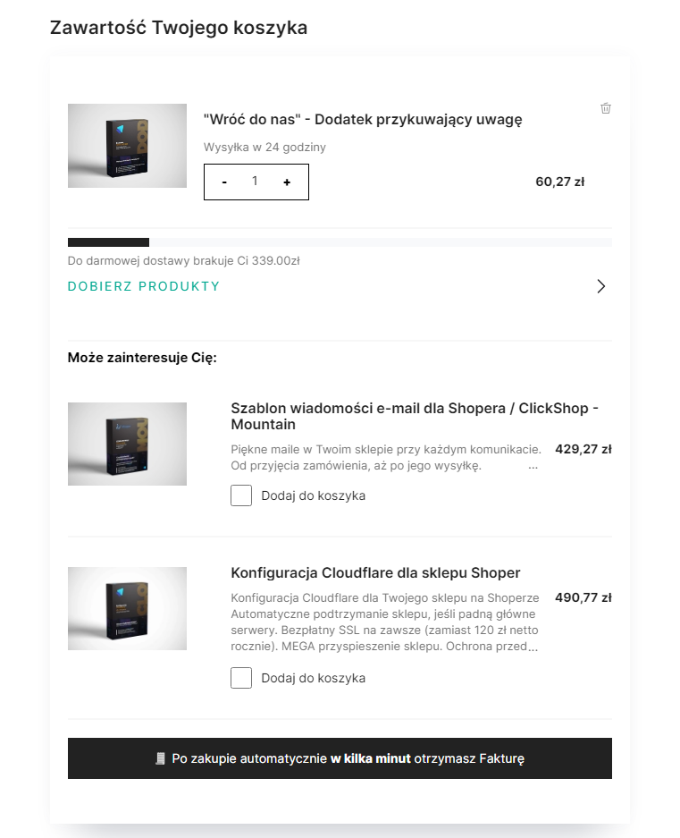 Taki produkt musi być bez wariantów. Musi to być bardzo szybka dosprzedaż i zakodowaliśmy to tak, aby klient jednym kliknięciem mógł dodać ten produkt do koszyka. Po dodaniu produktu strona koszyka automatycznie się odświeża z nowym produktem. Jeśli produkt z dosprzedaży znajduje się już w koszyku -> to nie pojawi się niżej w proponowanych "Może zainteresuje Cię:".