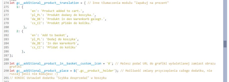 W okolicach linijki 264 we "Własnym skrypcie JS" odnajdziesz ustawienia dla szybkiej dosprzedaży w koszyku.