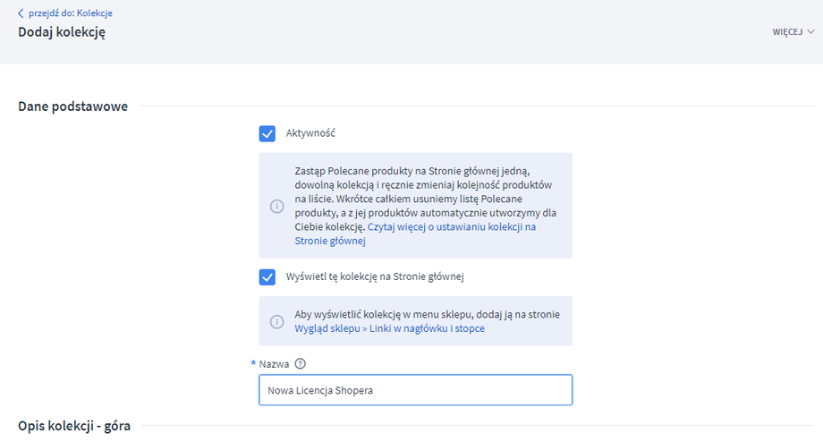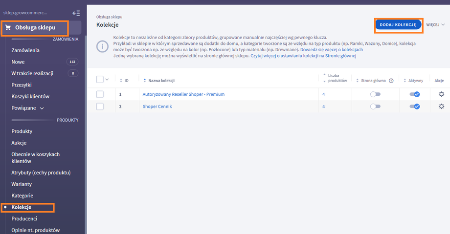 Wejdź w „Obsługa sklepu” -> Kolekcje.