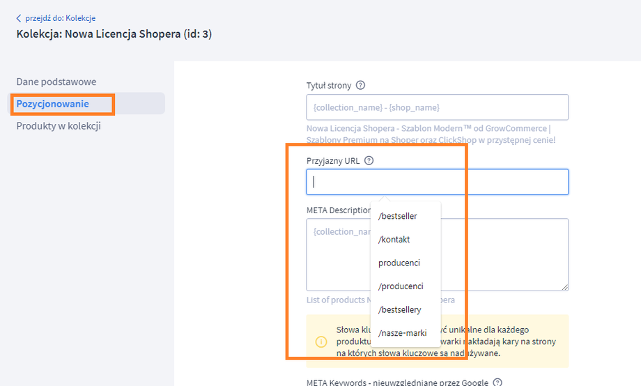 Nadaj kolekcji przyjazny adres url np. /słodkie-przekaski – taki, który oddaje praktycznie słownie to czego szukają klienci (seo). Nie zapomnij o zapisaniu zmian.
