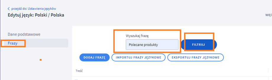 Dalej po lewej wybierz „Frazy”. Wyszukaj „Polecane produkty” i filtruj.