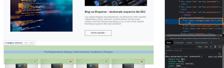 Na stronie głównej znajdują się polecane produkty. Ten sam wyraz jest przez Shopera stworzony jako element bardzo istotny czyli nagłówek najważniejszy na stronie z punktu widzenia pozycjonowania (h1). Raczej nikt z nas nie chce rankować na słowo „Polecane produkty”, bo i nikt tego nie szuka.