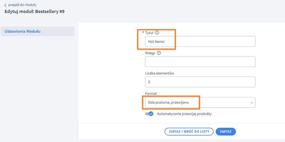 Poprawnie ustawiony moduł powinien być w formacie lista pozioma, przewijana jak powyżej. Możesz włączyć lub wyłączyć checkbox przy przewijaniu automatycznym produktów.