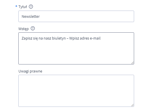Pierwszy nagłówek NEWSLETTER zostaje domyślnie. Drugi to wypełnione pole o nazwie "Tytuł". Trzeci tekst nad polem do wpisania to pole "Wstęp":