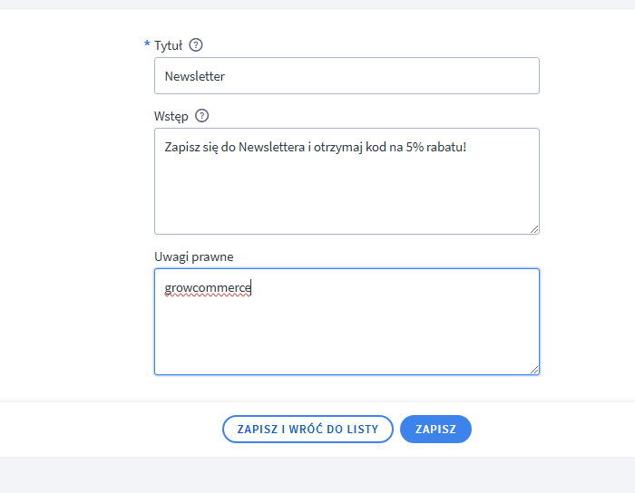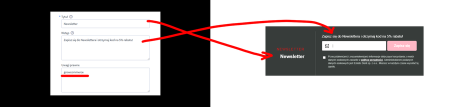 W edycji Newslettera możesz dodać do uwag prawnych nowe hasło - klucz -> growcommerce