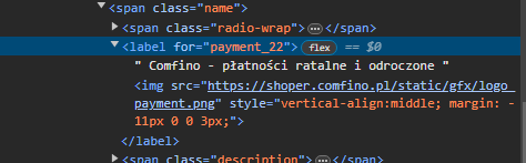 Żeby ładnie to ubrać przejdź do koszyka, kliknij na tekst płatności "Comfino" prawym przyciskiem myszy. Znajdziesz tam element "label" dla jakiegoś numerku czyli "for="payment_jakaś_liczba". Ta liczba nas bardzo interesuje.